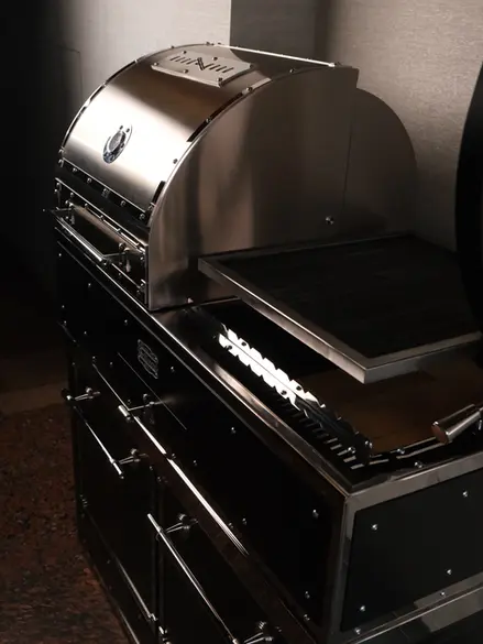The Grillvett Corvette grill features a height-adjustable lifting grate for grilling meat, poultry, fish, and vegetables, along with a smoker lid that supports both hot and cold smoking. It also includes a static grill for preparing extra portions.